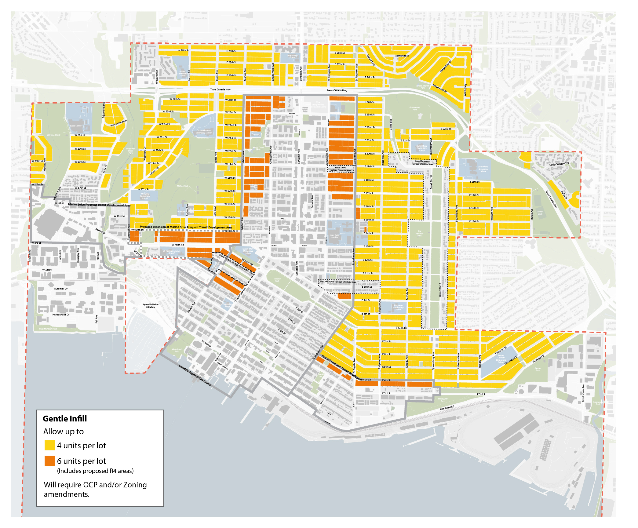 The map below shows the proposed areas of the City where we are considering low-density housing: up to four units in some residential areas and up to 6 in the city center and frequent transit areas.