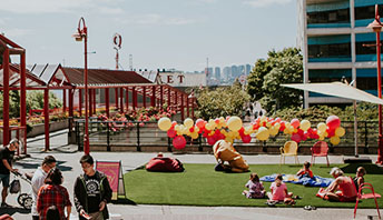 Civic Plaza is the perfect spot to relax, read a book, eat your lunch, and chat with friends. Located between City Hall and the City Library, it's decked out with two turf areas, benches, adirondack chairs, a tree shaded deck, and a community Play Box. To book this location fill out the City Venue Booking Application Form.